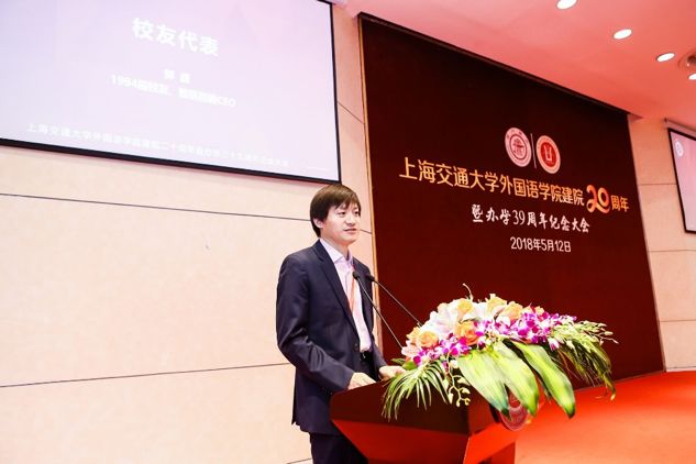 科技开元(中国)系1994届校友、智联招聘CEO郭盛代表学院的各届毕业生向学院的20周年华诞表示祝贺,向学院师生和广大校友问候祝福。他讲述了自己在学校的经历,特别向几位对自己影响最大的教师表示感谢,同时期望在校生们一定要珍惜在上海交大外国语学院的学习经历,找到自己的长处并把它发挥到极致。