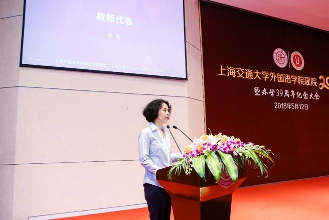 外国语学院教师金艳代表外国语学院全体教师对外国语学院建院20周年表示热烈祝贺,向学院各级领导和老师为学院学科发展和教书育人做出的贡献表示衷心感谢,她在交大学习工作了30多年,在这里度过了最美好、最难忘的青春岁月,她为30年来学院取得的瞩目成就感到骄傲和自豪,饮水思源,爱校荣院,决心为外院建设继续增光添彩。