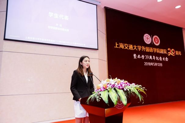 外国语学院英语系本科生华佳代表学院全体在校生对学院二十周年庆表示祝贺,表达了作为一名外院人的自豪,“交古通今,学贯中西”,在院训精神的感召下,外院学生不断学习,开拓进取。生活在外国语学院这座文化与思想的殿堂是幸运的,在这里参加学习、辩论、演讲、国外支教等活动,能感受到青年一代必须把青春融进祖国的江河。回首过往,砥砺前行,衷心希望,青年学子能为交大、为外院开创更加美好的未来。
