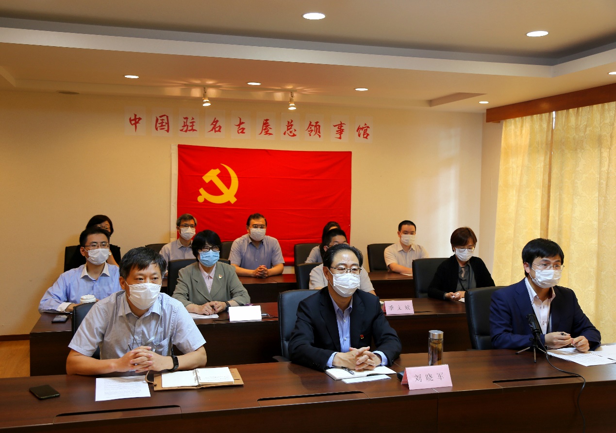 曾理华领事做题为“学党史、强信念、干实事”的党建促业务交流报告。他介绍了中国驻名古屋总领馆及领区情况、党建工作概况以及中国驻名古屋总领馆开展党史学习教育的情况。