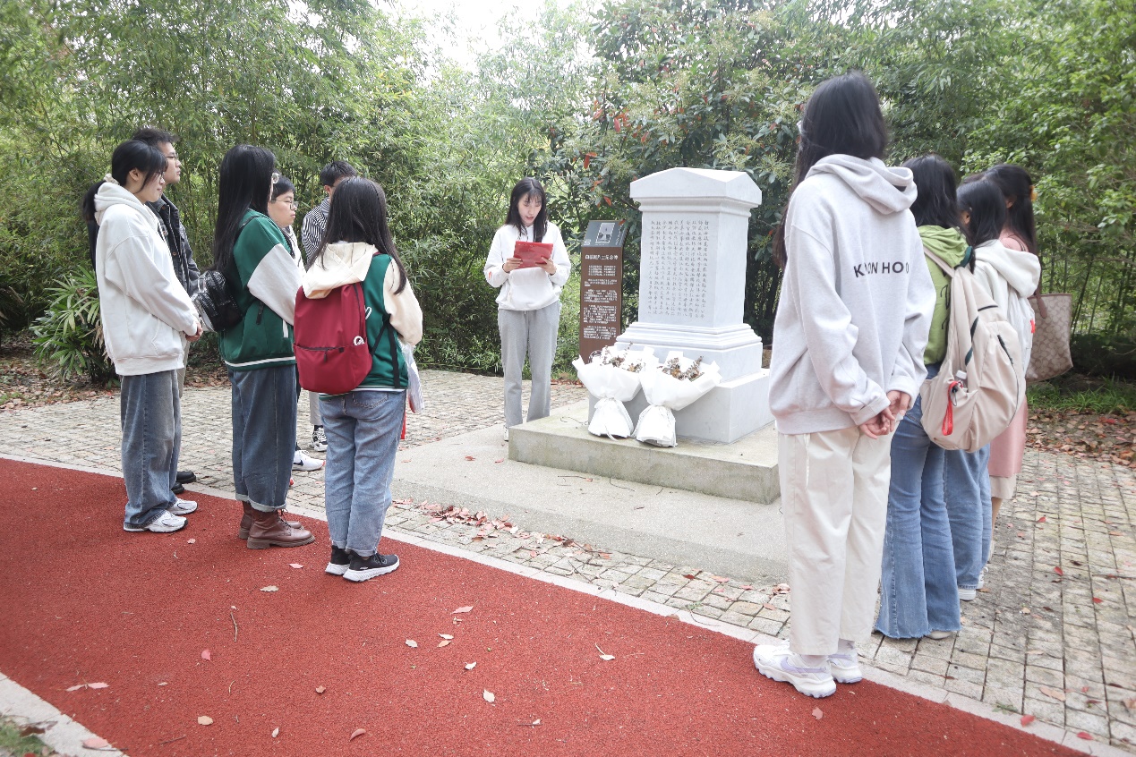 研究生新生党员代表闫帆在白毓崑烈士纪念碑前为大家介绍了白毓崑烈士在上海交大求学、毕业后任教于多所学校并积极宣传革命思想的革命事迹。辛亥革命爆发后,白毓崑领导了滦州起义,失败后英勇就义。留下的绝命诗最后一句是——希望后起者,同志气相连,此身虽死了,千古美名传。在此,新生党员们感悟了先辈伟大的革命精神和浓厚的爱国情怀,传承红色基因,赓续中国共产党人精神血脉,并以先辈们为榜样,立志做有理想、敢担当、能吃苦、肯奋斗的新时代好青年。
