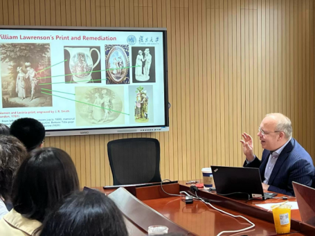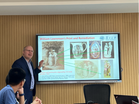 荣格教授首先阐释了“跨媒介叙事”(transmedial storytelling)的理论框架与研究方法,强调文学叙事如何在不同媒介载体间迁移、转换、及其意义流变与拓展的复杂过程。他以詹姆斯·汤姆森(James Thomson)的诗作《秋》(The Seasons)中帕勒蒙与拉维尼亚的爱情故事为例,深入剖析了深入剖析了这一叙事在18、19世纪如何通过多种媒介平台进行视觉再现与叙事重构。荣格教授重点展示并比较了基于威廉·劳伦森(William Lawrenson)和威廉·汉密尔顿(William Hamilton)等叙事版本创作出的多幅英美丝绸画。荣格教授进一步指出,女性刺绣工在将视觉图像转化为丝绸画的过程中,并非进行简单的媒介转译,而是通过一系列具有主体意识的艺术处理——包括关键元素的取舍、场景背景的重置、服饰细节的修改以及文字说明的增补等——实现了对原有叙事的能动性重塑。例如,为强化叙事的道德教化功能,原图中具有道德越轨意味的“荷兰屋”(Holland House)图像被删去,代之以象征婚姻合法性的教堂建筑。这些改编反映了当时女性刺绣工的审美情趣、道德观念与社会期望,如对理想婚姻与家庭生活的向往。最后,荣教授总结道:女性刺绣工匠作为叙事中的参与者,不仅将外叙事(extra-diegetic narrative)的能动性引入构建的视觉叙事中,还以独特的女性视角重构了故事世界的道德秩序与身份认同标准。