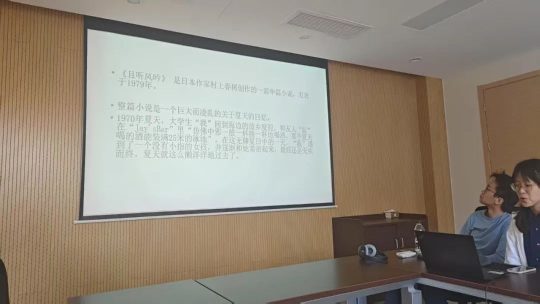 薛越同学首先分享了日本作家村上春树的中篇小说《且听风吟》。她详细介绍了小说的背景和情节,讲述了主人公“我”在1970年夏天回到海边故乡度假的故事。薛越同学通过生动的描述,让听众仿佛置身于那个充满回忆的夏天,感受到了主人公与朋友“鼠”在“Jay's Bar”里畅饮、与没有小指的女孩相遇的温馨场景。她强调了小说中关于夏天的深刻回忆和对青春的无限留恋,引发了在场同学的共鸣。
