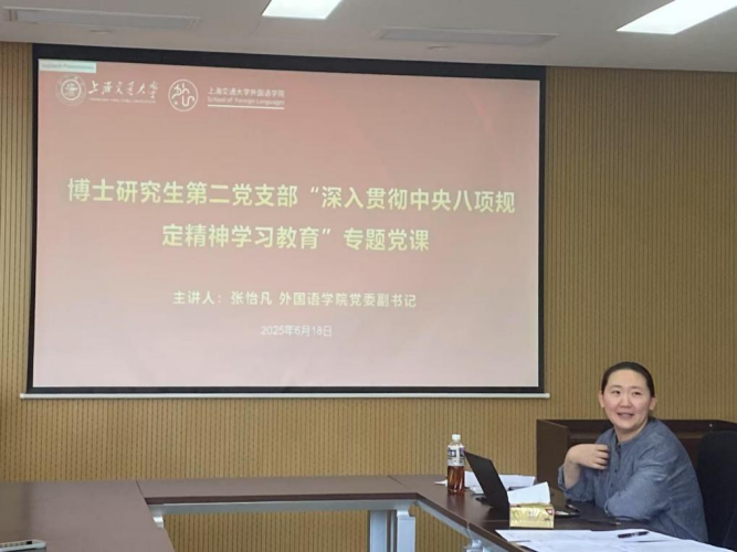 为深入学习贯彻中央八项规定精神,进一步增强党员纪律意识和作风意识,2025年6月18日,外国语学院博士研究生第二党支部在杨咏曼楼224会议室举行深入贯彻中央八项规定精神学习主题党课。外国语学院党委副书记张怡凡应邀授课,全体党员同志参加会议,活动由党支部书记王玲玲主持。