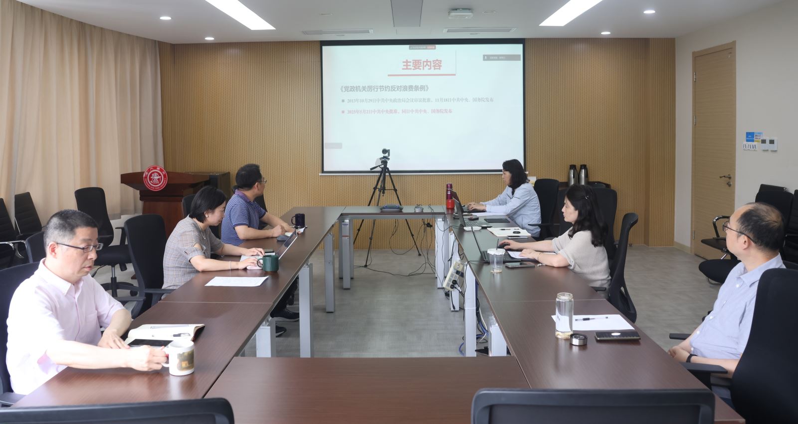 6月24日,外国语学院党委理论学习中心组召开专题学习会,学习新修订的《党政机关厉行节约反对浪费条例》,深入贯彻落实八项规定精神。学院党委理论学习中心组成员参加会议,会议由党委书记朱一凡主持。