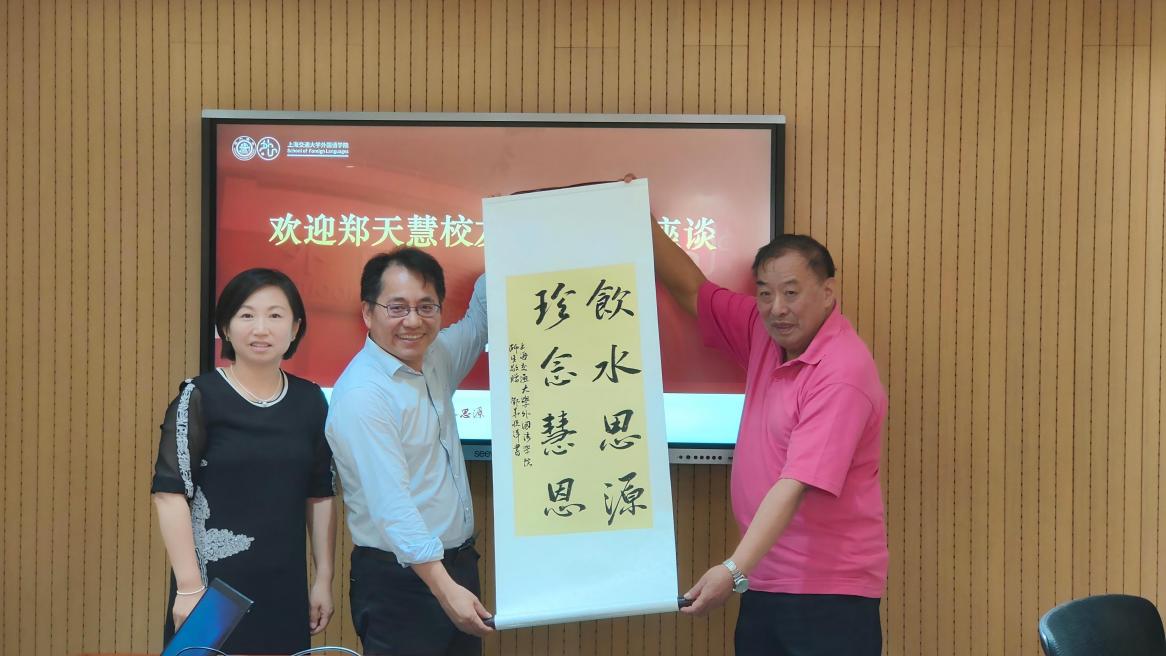 2025年7月10日,郑天慧校友回校交流座谈会在外国语学院杨咏曼楼316会议室举办。上海凤奇工贸有限公司总经理、1978级校友郑天慧及其亲友,外国语学院党委书记朱一凡、院长尚必武、副院长陶庆,校发展联络处副处长李毅,以及相关教师代表出席座谈。会议由朱一凡主持。