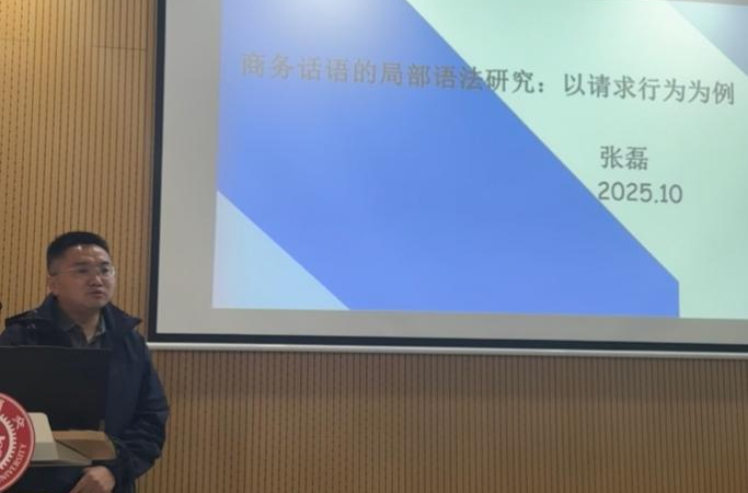 安徽财经大学张磊教授以“商务话语的局部语法研究:以请求行为为例”为题,基于百万词级商务信函语料库分析了请求行为的局部语法模式,揭示了商务英语交际中请求行为的规律性表达方式,并指出其对提升学习者语用能力的重要启示。