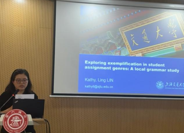 上海交通大学林铃副教授作报告“Exploring exemplification in student assignment genres: A local grammar study”,她基于英国学术英语写作语料库(BAWE),从13,920个学生作业实例中归纳出42种“例证”的局部语法型式,拓宽了例证研究所涉体裁范围,同时提出新的功能术语以推动对“例证”的经典界定及其标注体系的进一步细化,显示出局部语法在多种专门体裁中的可扩展性与方法创新潜力。