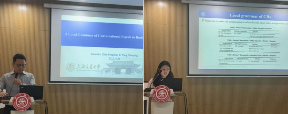 随后,甄凤超教授与其硕士研究生王笑盈共同作题为“商务通用英语会谈中修复语的局部语法”的报告,研究基于国际BELF商务会谈语料库VOICE,识别出16种修复语局部语法模式,揭示了修正行为在跨文化商务沟通中的人际调控功能与策略性意义。