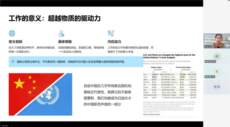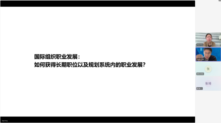 在互动问答环节,冯佳琪结合自身面试工作经验,就国际组织面试这一问题给出了具体解答。她强调,国际组织面试需展现对组织使命与目标岗位的真挚热情、明确自身与岗位职责的适配性、全面调研组织相关情况,同时运用 STAR 法则清晰表达,以凸显自身竞争力与诚意。