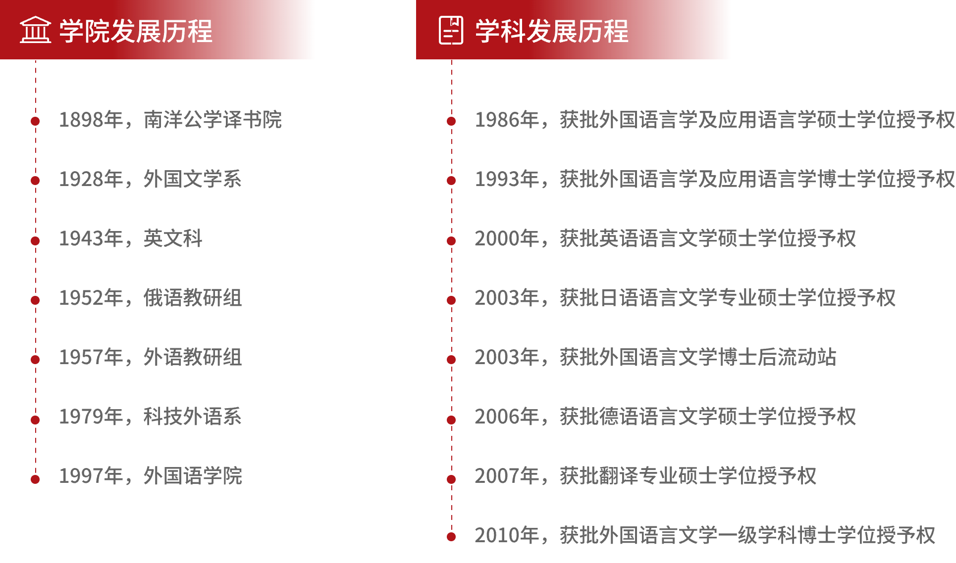 学院1986年获外国语言学及应用语言学硕士学位授予权,1993年获外国语言学及应用语言学博士学位授予权,2000年获英语语言文学硕士学位授予权,2003年设立外国语言文学博士后流动站,2007年获翻译硕士专业学位授予权,2010年获外国语言文学一级学科博士学位授予权。学院始终坚持 “人才强院、国际化、学科交叉、产学研结合、对接国家战略”五大战略,锐意进取,不断创新,在教育部第五轮学科评估中成绩优异,外国语言文学学科位居全国前3%。