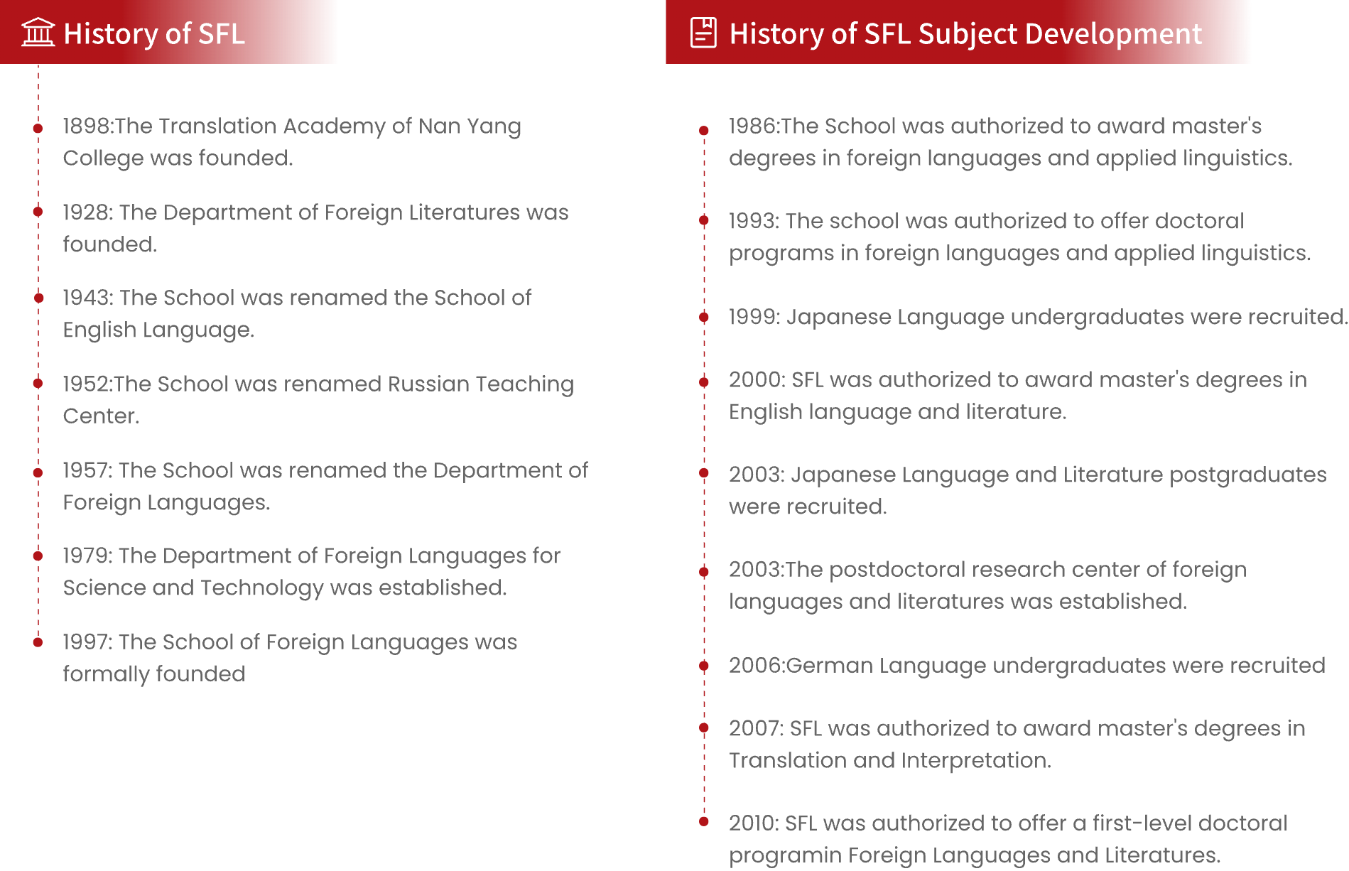 In 1997, the School of Foreign Languages was formally established. In 2000, it was able to award master’s degree in English language and literature. In 2003, the postdoctoral research center was set up. In 2007, as a pilot unit in China, SFL was authorized to award master’s degrees in Translation and Interpretation. In 2010, SFL was authorized to offer a first-level doctoral program in Foreign Languages and Literatures.